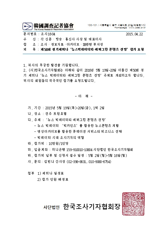 안녕하십니까? (사)한국조사기자협회는 아래와 같이 2016년 5월 19일~20일 이틀간 제50차 정기 세미나를 ‘뉴스 빅데이터 활용과 에버그린 콘텐츠 전망’ 주제로 개최하고자 합니다. 협회원들의 적극적인 참가를 요청드립니다. - 아 래 - 가. 기간 : 2016년 5월 19일(목)~20일(금), 1박 2일 나. 장소 : 전주 르윈호텔 다. 주...